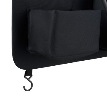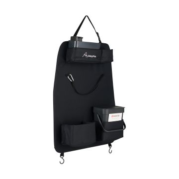 Die Befestigung erfolgt bei allen Modellen oben mittels eines einstellbaren Straps mit Schnellverschluss um die Streben der Kopfstütze. Damit der Organizer nicht lose herumhängt, gibt es für den unteren Teil zwei dehnbare Straps mit Haken. Diese lassen sich hinter den vorhanden Kunststoffabdeckungen am Sitz befestigen. Somit kann der Organizer super schnell und simpel (de-)montiert werden.